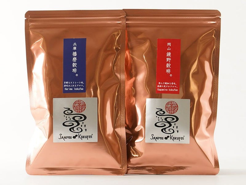 穀琲のベースである元祖ブレンドの「兵庫 播磨穀琲」と、薬樹くろもじの茶葉をブレンドした「岡山 鏡野穀琲」のセット。
