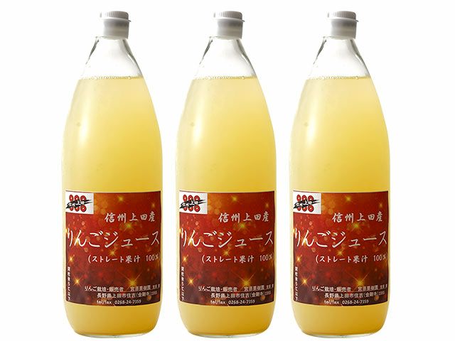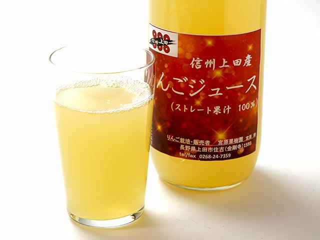 長野県上田市の宮原果樹園で作られた完熟の甘いりんごを搾った果汁100%ジュースです。