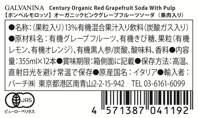 有機濃縮グレープフルーツジュース、有機蔗糖、有機レモンピュレ、有機濃縮人参ジュース、炭酸、クエン酸、香料(グレープフルーツ他天然由来)