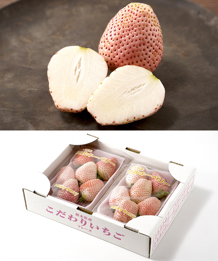 栃木生まれの白い果皮が特徴の希少品種「ミルキーベリー」。酸味が非常に少なく、ミルクのようなやさしい甘さが広がります。