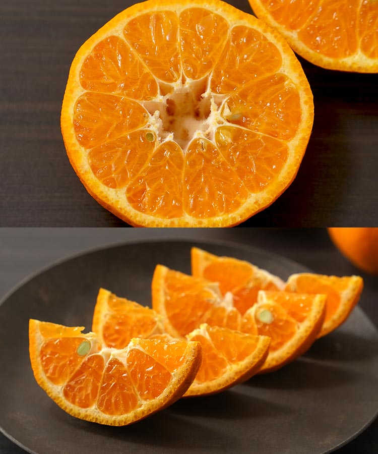 ポンカンはインド原産の亜熱帯柑橘で、日本には明治時代に伝わりました。果肉はやや弾力があり、プリッとした食感。口に含むと、まず豊かな香りが立ち、その後に濃厚な甘みと穏やかな酸味が広がります。