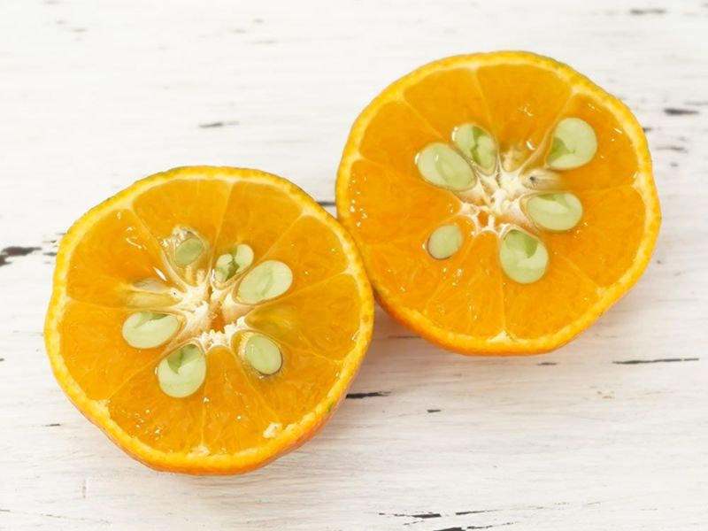 シークワーサーはレモンほどではないですが酸味が強い香酸柑橘です。中田さんのシークワーサーはしっかり完熟してから収穫しているので、酸味のカドがとれてマイルド。香りも良く、コクがあります。レモンと同じく、木成りが長く熟成すると果皮が緑から変化します。オレンジ色は完全完熟状態です。