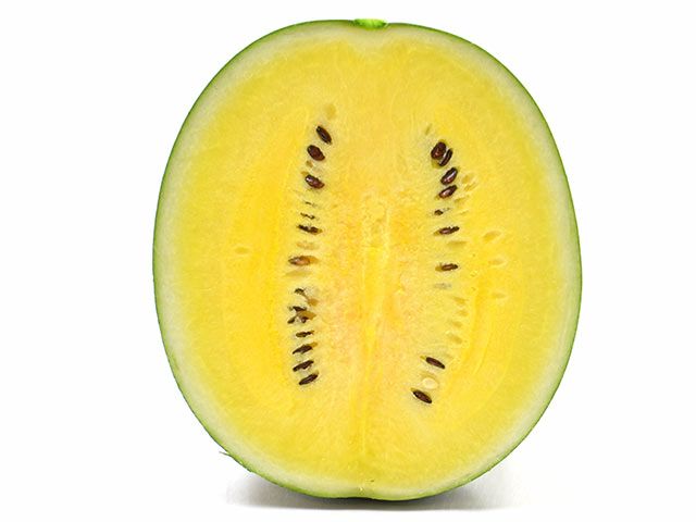 『ひとりじめ』という赤肉品種と、果肉が黄色で皮が黒の『イエローBonBon』です。1玉2.3kg程度の小玉スイカで、4人ぐらいで1玉召し上がるのにちょうどよいサイズです。