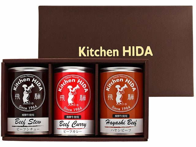 飛騨牛ステーキ専門店のオリジナル缶詰。上質な脂となめらかな口当たりの飛騨牛を贅沢に使用。ビーフカレー、ビーフシチュー、ハヤシビーフ各1。1缶で2-3人前。