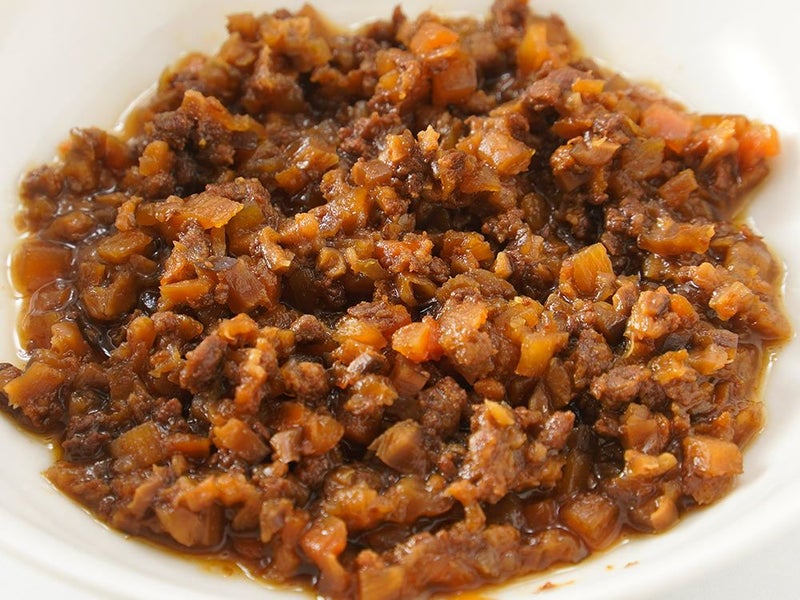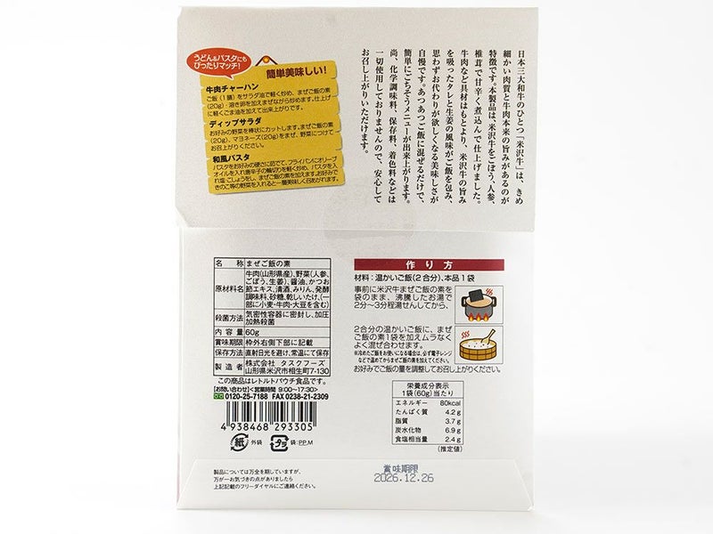 牛肉(山形県産)、野菜(人参、ごぼう、生姜)、醤油、かつお節エキス、清酒、みりん、発酵調味料、砂糖、乾しいたけ、(一部に小麦・牛肉・大豆を含む)