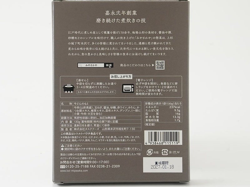 牛肉(山形県産)、玉ねぎ、醤油、砂糖、赤ワイン、みりん、かつお節エキス、椎茸エキス、昆布エキス、デンプン、(一部に小麦・牛肉・大豆を含む)