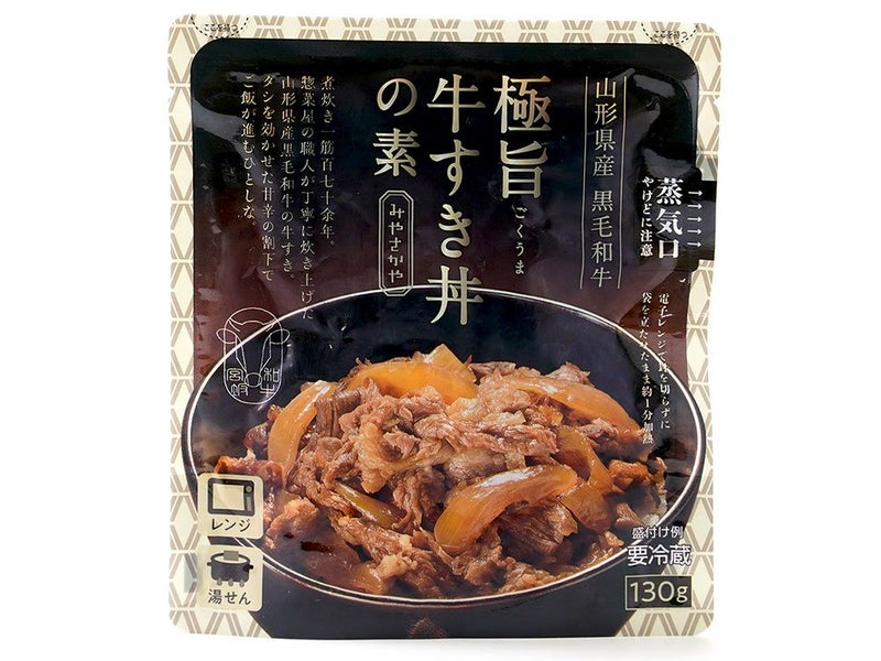 山形県産黒毛和牛を甘辛の割下で炊き上げた牛すき丼の素。電子レンジ調理で手軽に本格的な味が楽しめます。