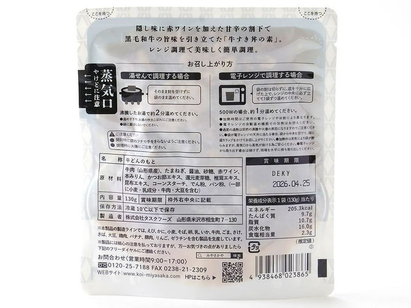 山形県産黒毛和牛を使用し、甘辛の割下で炊き上げた牛すき丼の素。出汁を効かせた味付けにより、肉の旨味とご飯の相性を最大限に高めています。さらに隠し味として赤ワインを加えることで、コクと奥行きのある味わいに仕上げました。