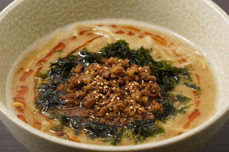 濃厚豆乳担々麺は、スープと具材を湯煎し、麺を茹でて合わせるだけ。仕上げに三重県産あおさを添えれば、磯の香りが加わり、店の一皿に近づきます。冷やしでも楽しめるので、季節に応じた楽しみ方が可能です。