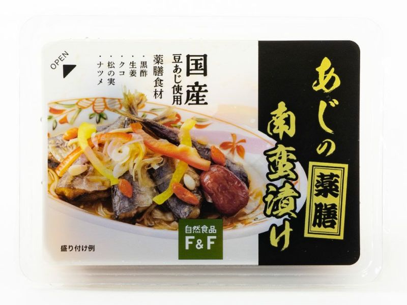 薬膳食材を使った国産まめあじの南蛮漬け。解凍するだけで簡単にお召し上がりいただけます。
