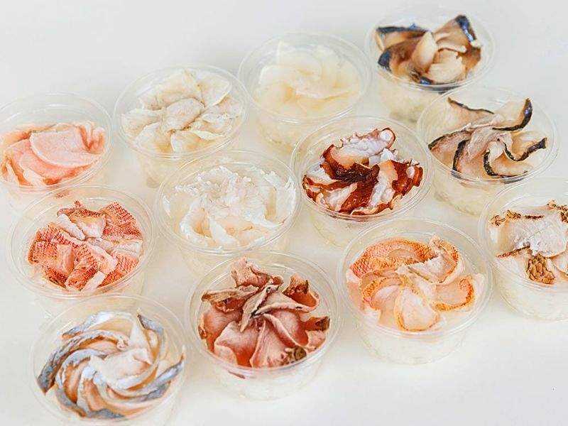 加工はすべて北茨城市内の自社工場で行われ、鮮度を落とさないために“港から最短距離”で処理。職人がひとつひとつ手作業でネタを切り分け、愛らしい手まり寿司の形に整えます。最大のポイントは、素材の細胞を壊さずに旨味と香りを閉じ込める“急速冷凍技術”。これにより、漁港さながらの風味をそのまま食卓へ届けることができます。 地域の海産物・農産物・畜産物を活かすことを理念に、原料はすべて地元の新鮮素材にこだわり、無駄のない丁寧な工程で仕上げられています。