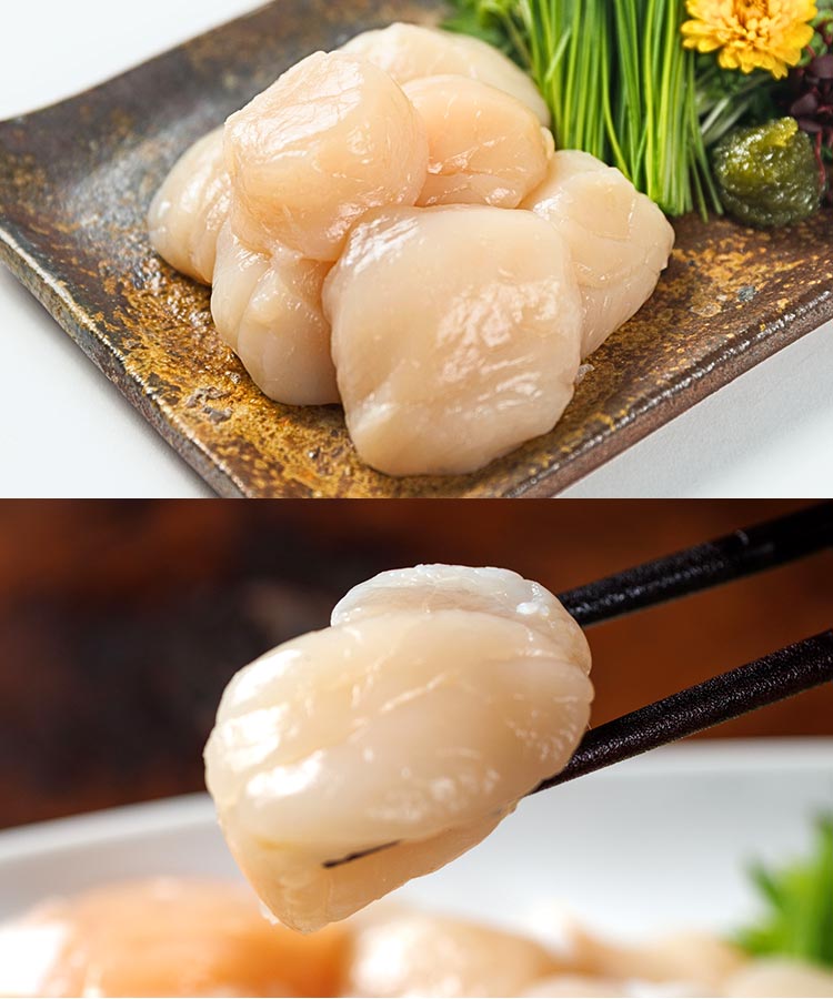 最も甘い時期の貝柱を急速冷凍。解凍後は生でも食べられます。サイズはバラバラなふぞろい品。