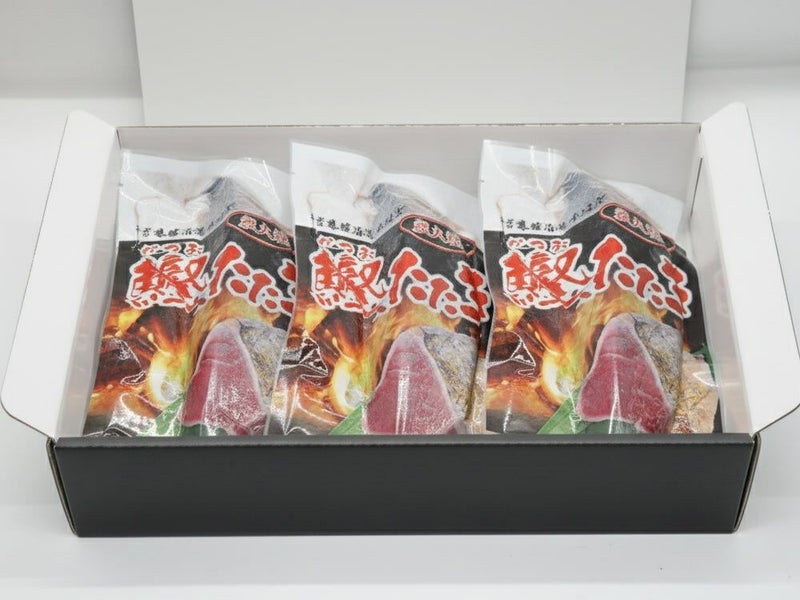 一本釣り鰹ならではの引き締まった身質と、炭火由来の香りが合わさり、解凍して切るだけで専門店の味わい。付属の勝浦産塩「新月の煌」が、鰹の旨味をさらに引き立てます。
