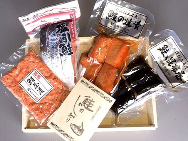 塩引鮭3切、鮭の焼漬け4切、鮭の昆布巻3本、鮭茶漬80g