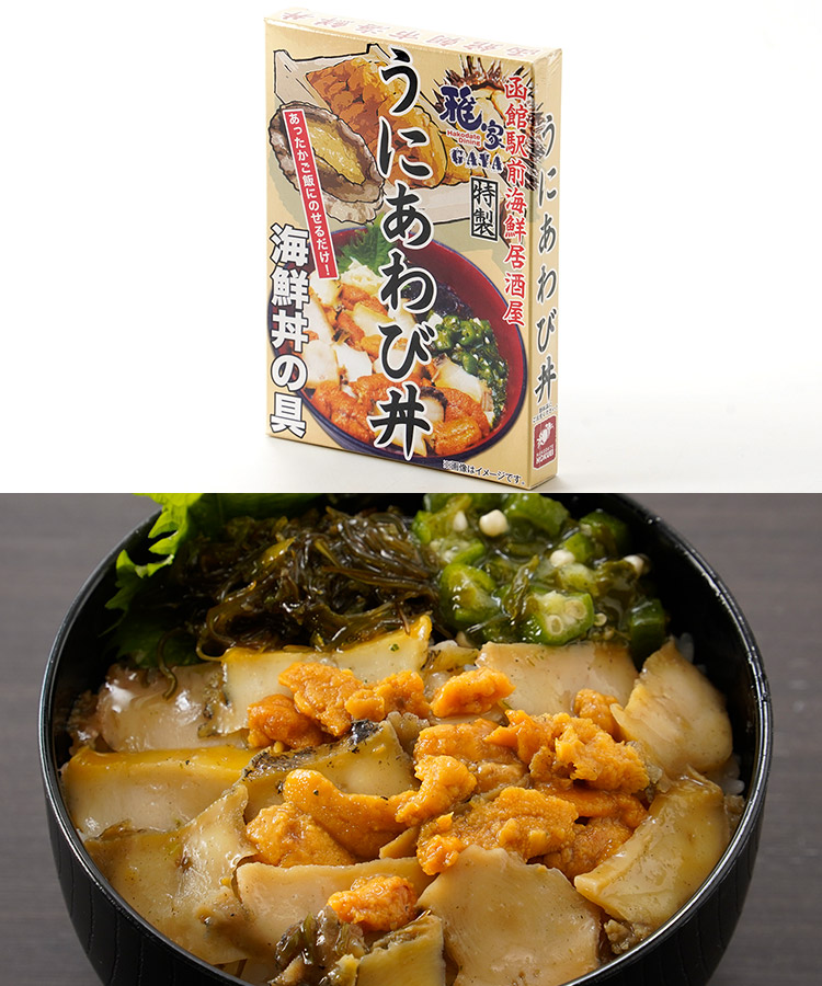 【うにあわび丼】あわび(北海道産)うに、めかぶ、おくら、モロヘイヤ、醤油、砂糖、山芋、がごめ昆布(北海道産)、発酵調味料(糖類、酒精、米、食塩、米麹)、アミノ酸液、清酒、風味調味料、昆布エキス、鰹節エキス、魚醤、果糖ぶどう糖液糖、食塩/調味料(アミノ酸等)、ソルビット、pH調整剤、増粘多糖類、香料、保存料(ソルビン酸K)(一部に小麦・大豆・山芋を含む)