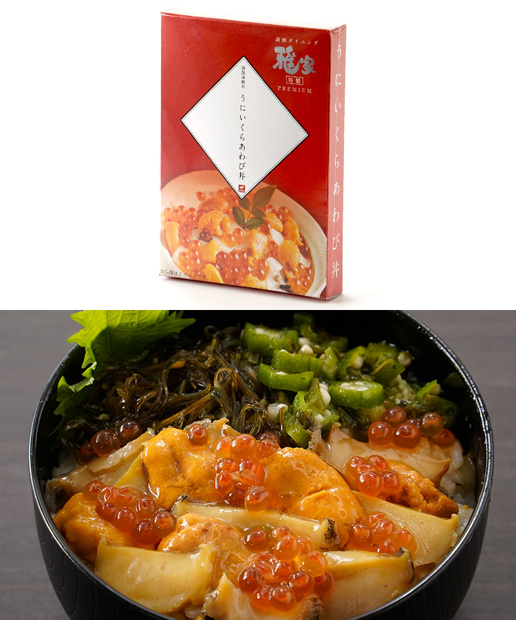 【うにいくらあわび丼】あわび(北海道産)うに、鮭卵、めかぶ、おくら、モロヘイヤ、醤油、砂糖、山芋、がごめ昆布(北海道産)、発酵調味料(糖類、酒精、米、食塩、米麹)、アミノ酸液、清酒、風味調味料、昆布エキス、鰹節エキス、魚醤、果糖ぶどう糖液糖、食塩/調味料(アミノ酸等)、ソルビット、pH調整剤、増粘多糖類、香料、保存料(ソルビン酸K)(一部に小麦・大豆・山芋を含む)