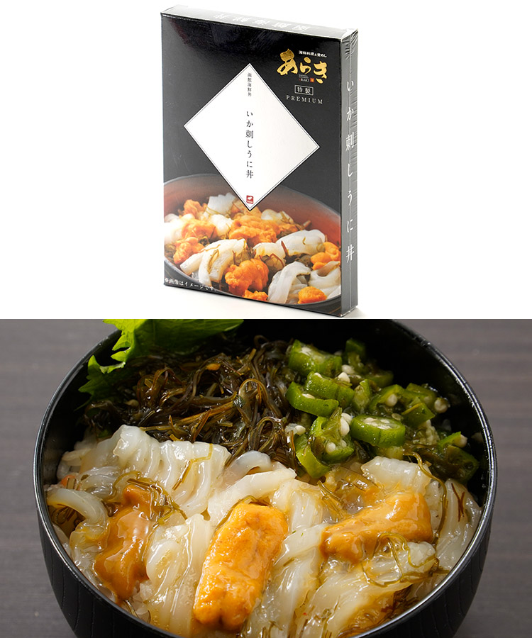 【いか刺しうに丼】いか(国産またはロシア産)うに、めかぶ、おくら、モロヘイヤ、醤油、砂糖、山芋、がごめ昆布(北海道産)、発酵調味料(糖類、酒精、米、食塩、米麹)、アミノ酸液、清酒、風味調味料、昆布エキス、鰹節エキス、魚醤、果糖ぶどう糖液糖、食塩/調味料(アミノ酸等)、ソルビット、pH調整剤、増粘多糖類、香料、保存料(ソルビン酸K)(一部に小麦・大豆・山芋を含む)