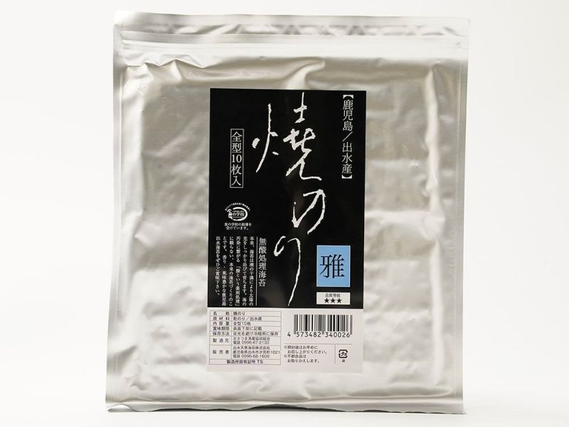 鹿児島県出水産の焼きのり「雅」。通常の海苔は海の農薬ともいえる「酸という薬剤処理」を行いますが、雅は希少な無酸処理海苔です。
