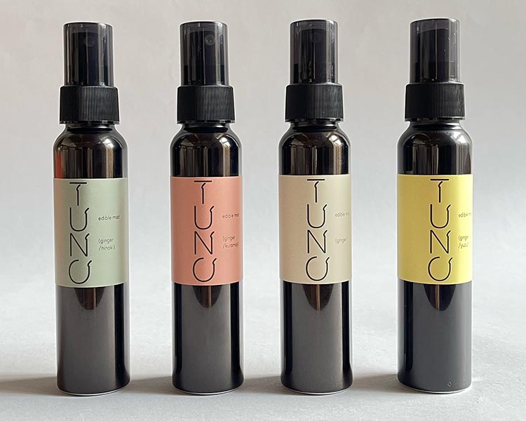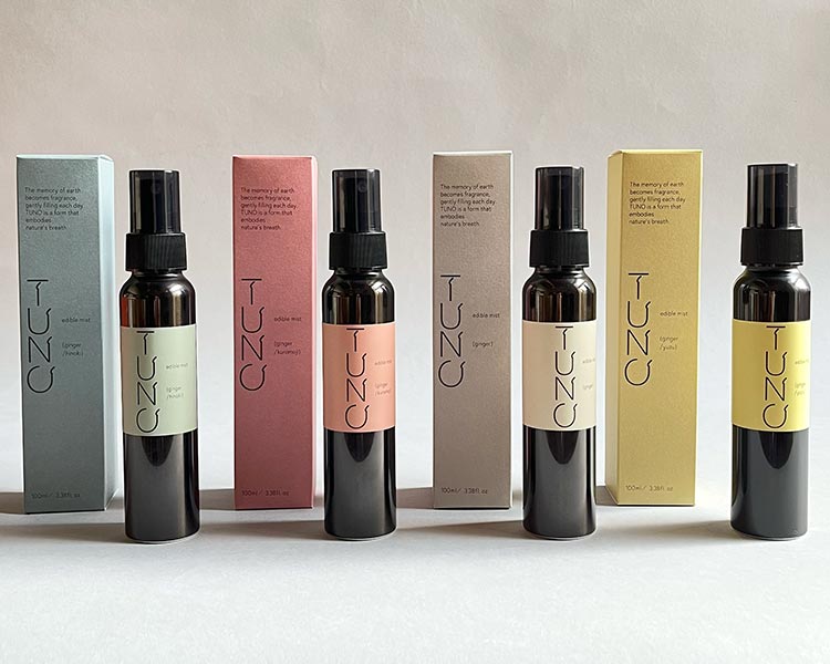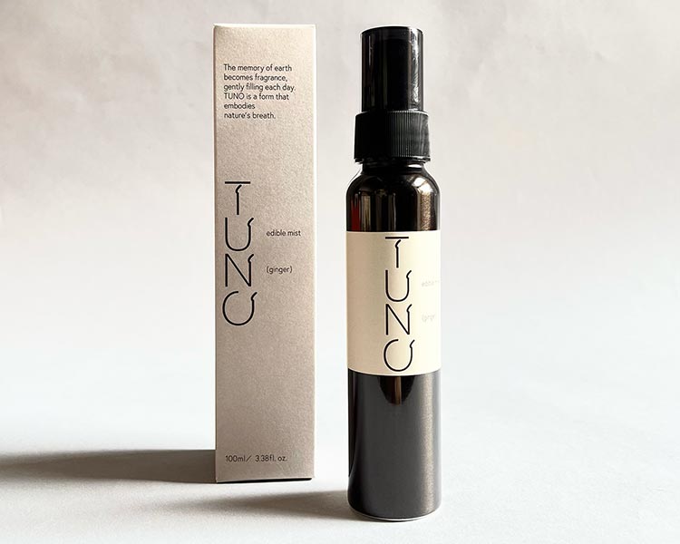 TUNOの原点は、三重の里山で育つ親生姜です。若生姜とは異なり、根茎に蓄えられた力強い香気成分と土のニュアンスが特徴ですが、規格や用途の制約から余剰になりがちでした。そこで山本氏は、抽出・蒸留の工程を通じて香りの層を丁寧に分解し、人工的な強さに頼らない設計を追求。ヒノキ、ユズ、クロモジといった天然素材を重ね、料理や空間に溶け込む“食べられるミスト”として再構築しました。