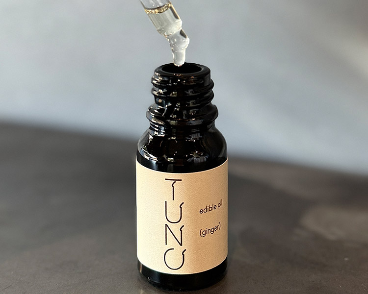 TUNOは単純な調味料ではありません。料理の仕上げに1~2滴垂らすことで、土の記憶を思わせる生姜の香りが立ち上がります。