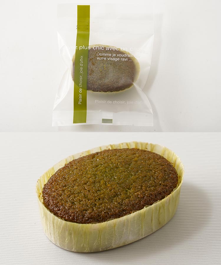 グルテンフリーの米粉フィナンシェ。京都上辻園の宇治抹茶をたっぷり使い、風味豊かに仕上げました。しっとり、フワフワとした食感。