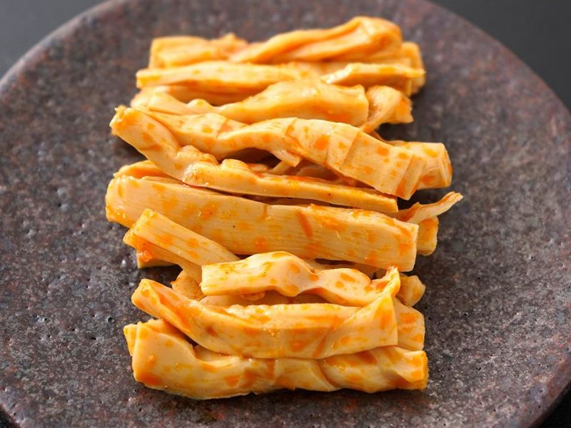 メンマ職人がつくる純国産メンマ。芳醇な風味と歯切れの良い完熟発酵めんまを、とんこつ風の濃厚な下味を漬け、香味ラー油で絡めました。