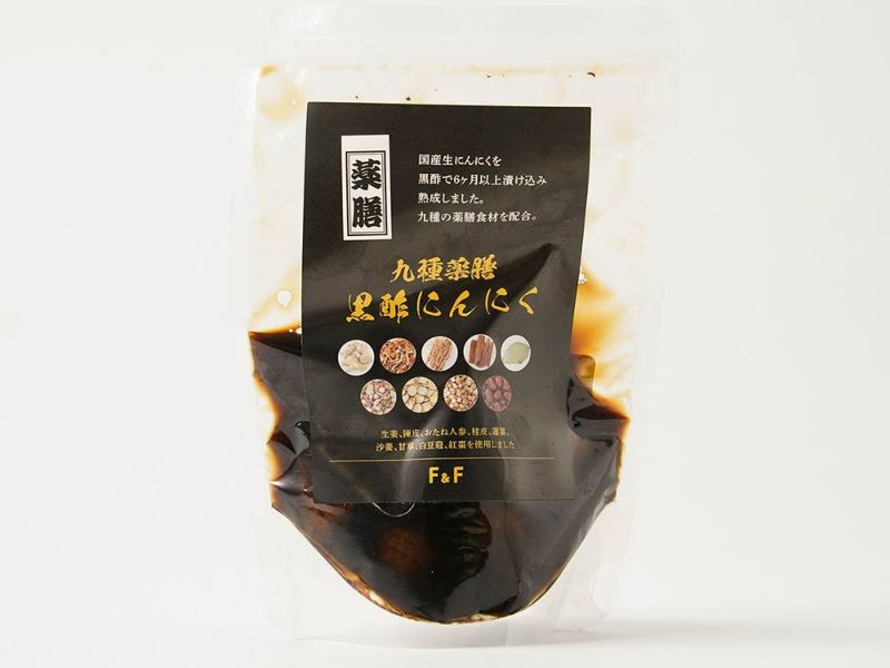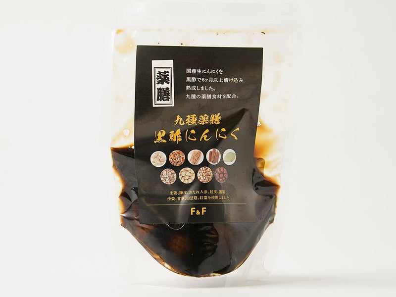 国産生にんにくを黒酢で180日以上漬け込んだ熟成黒酢にんにく。九種の薬膳食材を配合しています。