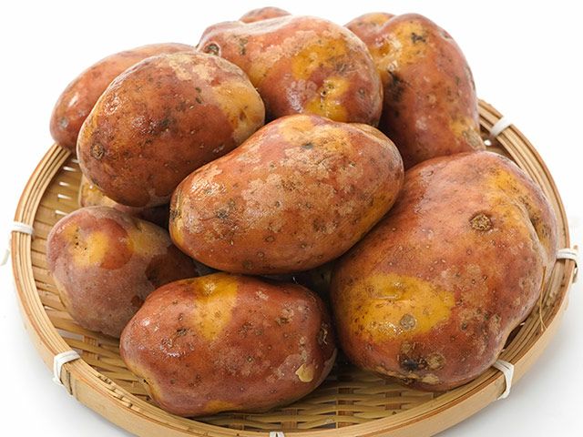 インカのめざめを品種改良して出来た品種なので、よく似ています。甘くて栗やナッツのような香りがあり、インカのめざめよりしっとりした食感です。表面のまだら模様が特徴的です。