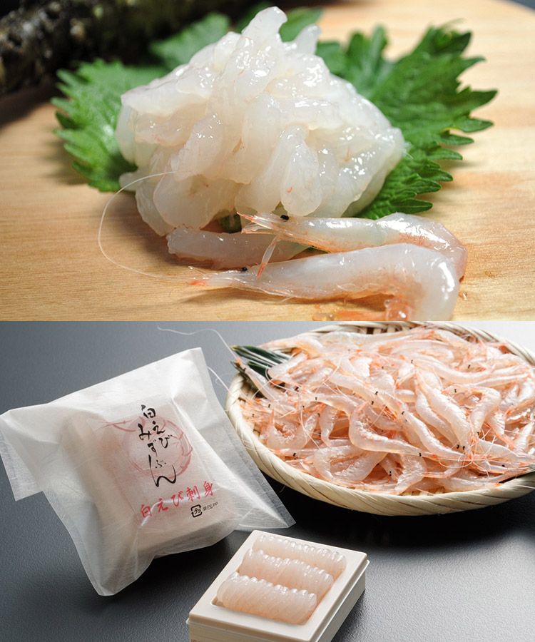 富山湾の宝石と呼ばれるほど美しく美味しい白えび。富山湾でしか獲れない希少なえびをお刺身に。職人が丁寧に並べた贈答に使える逸品。