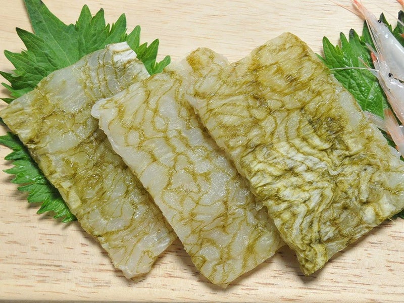 富山湾の宝石と呼ばれるほど美しく美味しい白えび。白えび刺身をおぼろ昆布で〆た逸品。