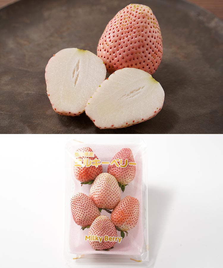 栃木生まれの白い果皮が特徴の希少品種「ミルキーベリー」。酸味が非常に少なく、ミルクのようなやさしい甘さが広がります。