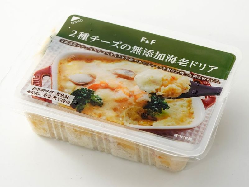 自然食品F&Fオリジナルの無添加冷凍食品。北海道産ナチュラルチーズとイタリア産パルミジャーノを贅沢に使った海老ドリアです。化学調味料、着色料、増粘剤などの添加物を使わずにつくりました。