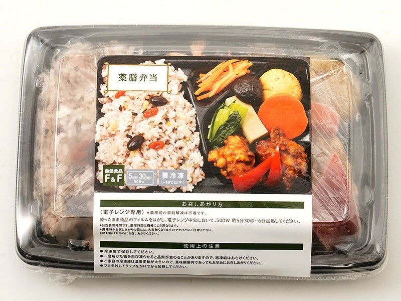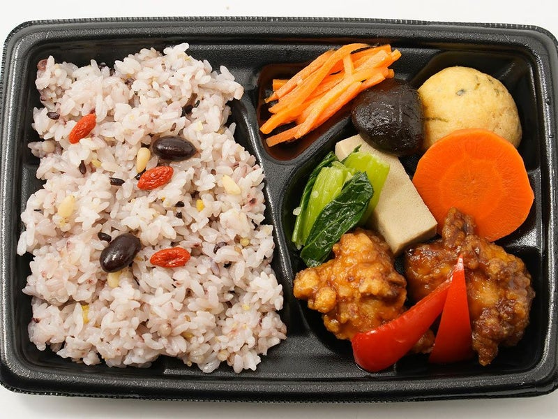 雑穀ご飯(白米、黒米、その他)(国産)、鶏唐揚げ黒酢餡(国内製造)、煮物(がんもどき、高野豆腐、人参、椎茸)(国産)、人参マリネ、小松菜ナムル、パプリカ、黒豆煮、松の実、クコの実/豆腐用凝固剤 (一部に小麦・乳を含む)