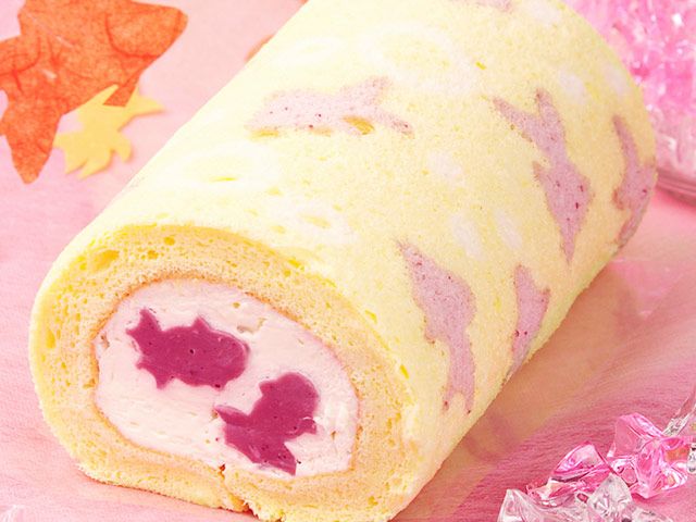 純生クリームをふわふわの生地で包み込んだ無添加ロールケーキ。金魚形のムースをあしらったご当地ロールです。
