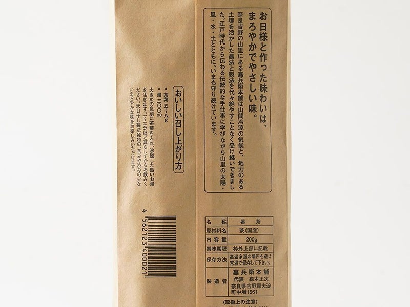 この製法は吉野地域にのみ伝わる極めて希少な方法で、かつて数千軒あった茶農家のほとんどが辞めたいま、嘉兵衛本舗が守る“日本の食文化そのもの”。天日干しによって余計な渋みや苦味が抜け、茶葉が丸みのある風味に仕上がります。カフェインも少なく、小さなお子さまから年配の方まで安心して飲める、やさしい味わいのお茶です。
