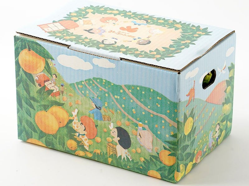 農園のコンセプトである「人とのつながりを大切にし、みかんで『笑顔・幸せ・感謝・未来』を創造し世界中に有田みかんを届けたい」という想いがデザインされている箱です。