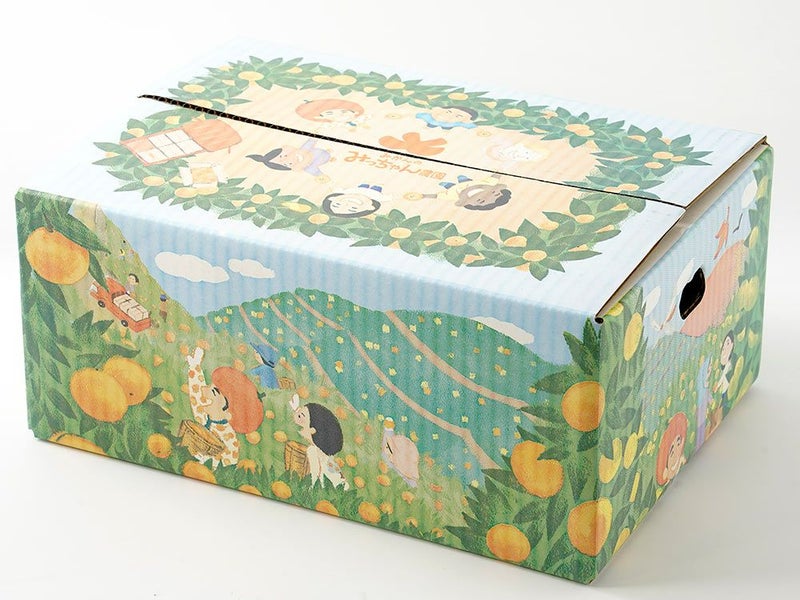 農園のコンセプトである「人とのつながりを大切にし、みかんで『笑顔・幸せ・感謝・未来』を創造し世界中に有田みかんを届けたい」という想いがデザインされている箱です。