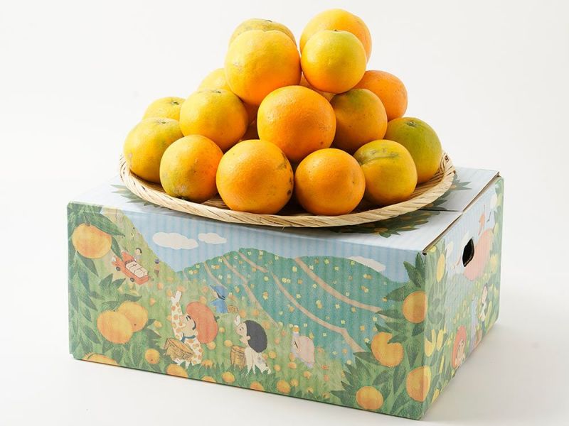 農園のコンセプトである「人とのつながりを大切にし、みかんで『笑顔・幸せ・感謝・未来』を創造し世界中に有田みかんを届けたい」という想いがデザインされている箱です。