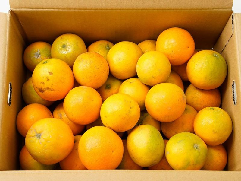 甘みがあって爽やかな酸味があります。夏にぴったりな味わいです。バレンシアオレンジ特有の回青(かいせい)という現象で皮が青くなりやすいです。皮の色に関わらず、木成りで完熟しているものを収穫しているため、どれも甘みがのっています。