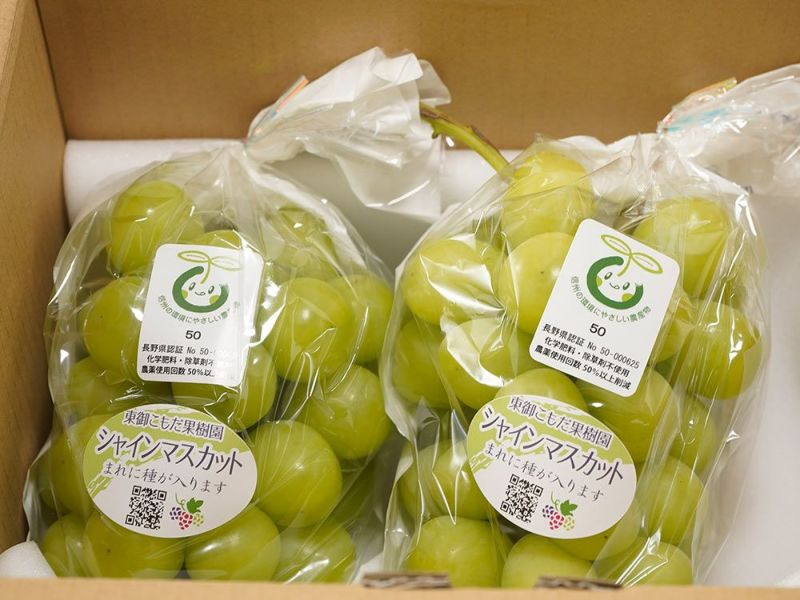 食の安全にもこだわり、長野県「信州の環境にやさしい農作物」として化学農薬50%削減、化学肥料不使用の認証を受けています。農薬を減らすと病気のリスクが増えてとても手間がかかりますが、ぶどうの状態をみながら有機肥料の成分を調整し、愛情をこめて育てています。
