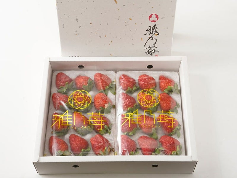箱は和紙のような手触りで、雅乃苺の文字とともに上品な和風に仕立てられています。高級感があり、贈答品に最適です。