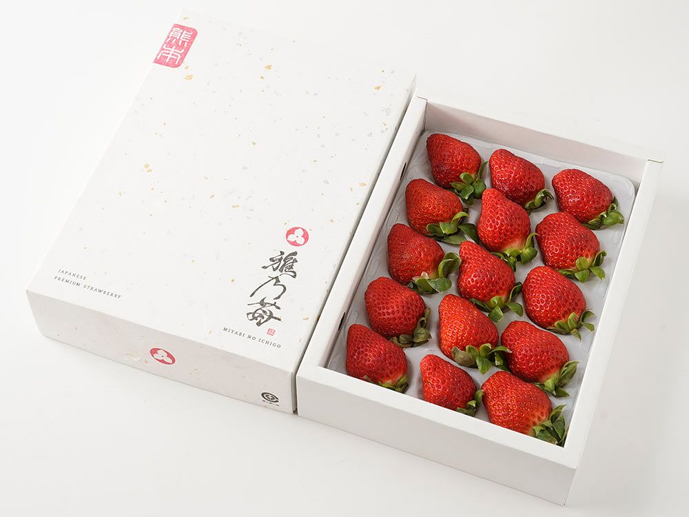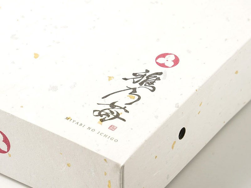 箱は和紙のような手触りで、雅乃苺の文字とともに上品な和風に仕立てられています。高級感があり、贈答品に最適です。
