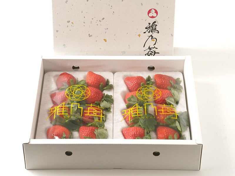 箱は和紙のような手触りで、雅乃苺の文字とともに上品な和風に仕立てられています。高級感があり、贈答品に最適です。