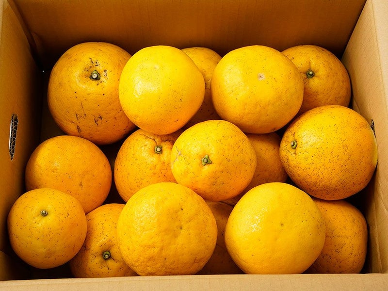 河内晩柑は右田柑橘がある天水町のお隣り河内町で昭和10年に発見された品種。文旦の血を引いていて偶然発生した果実と言われています。春から夏まで収穫できる珍しい柑橘です。