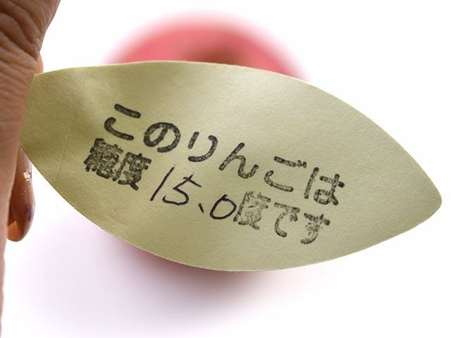 那由多のりんご園では、お届けするすべてのりんごを糖度センサーでチェックし、1個ずつ糖度を印字した紙をお付けしています(家庭用は1箱に1枚添付)。当然、糖度を表示するなら甘くないものを出荷するわけにはいきません。家庭用は12度以上、贈答用は14度以上を基準にしているので贈り物にも安心です。
