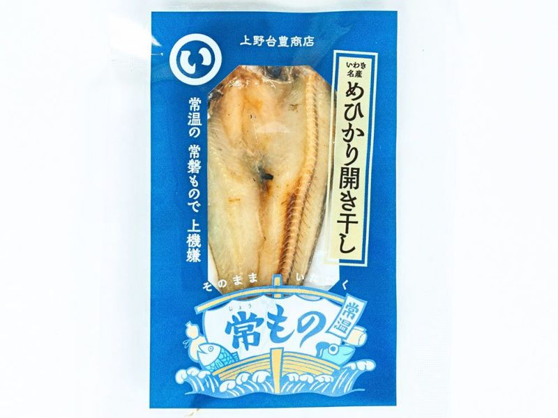 目光(メヒカリ)開き干しは、小名浜名物として知られる一品。特大サイズのみを使い、最低限の塩で仕上げることで、身の甘みと脂の旨さが際立ちます。