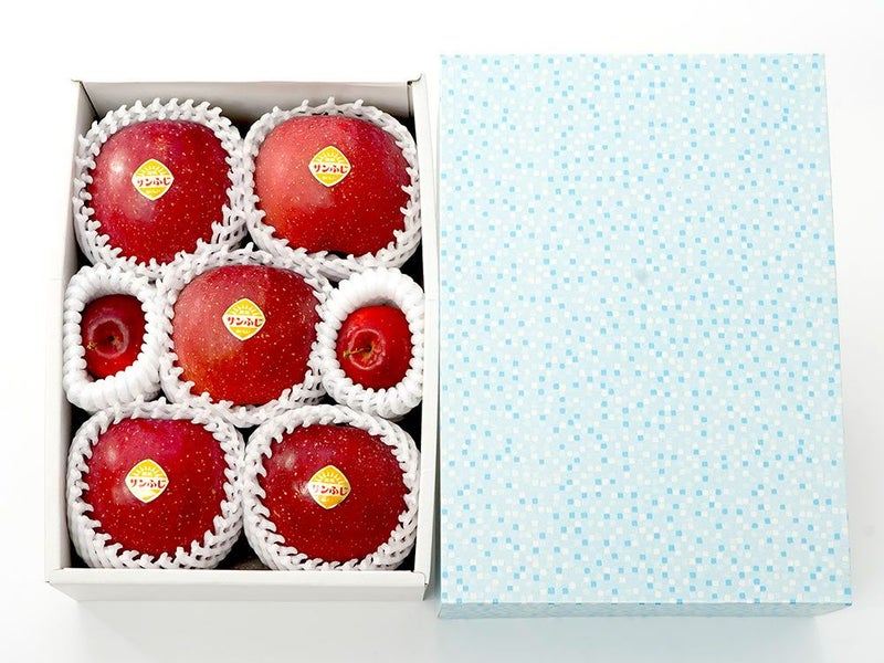 りんごを化粧箱に入れてお送りいたします。3箱まで一括して発送が可能です。 りんご1個のサイズは300g前後のものです。
