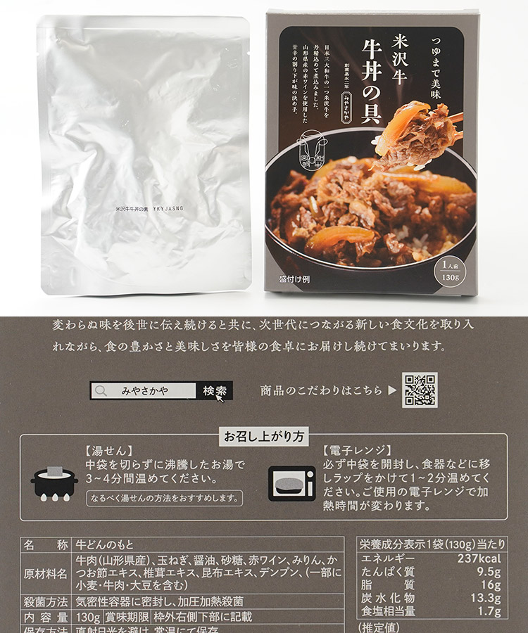 牛肉(山形県産)、玉ねぎ、醤油、砂糖、赤ワイン、みりん、かつお節エキス、椎茸エキス、昆布エキス、デンプン、(一部に小麦・牛肉・大豆を含む)