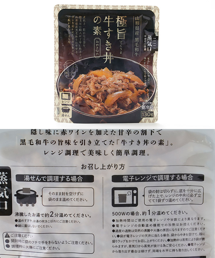 山形県産黒毛和牛を甘辛の割下で炊き上げた牛すき丼の素。電子レンジ調理で手軽に本格的な味が楽しめます。