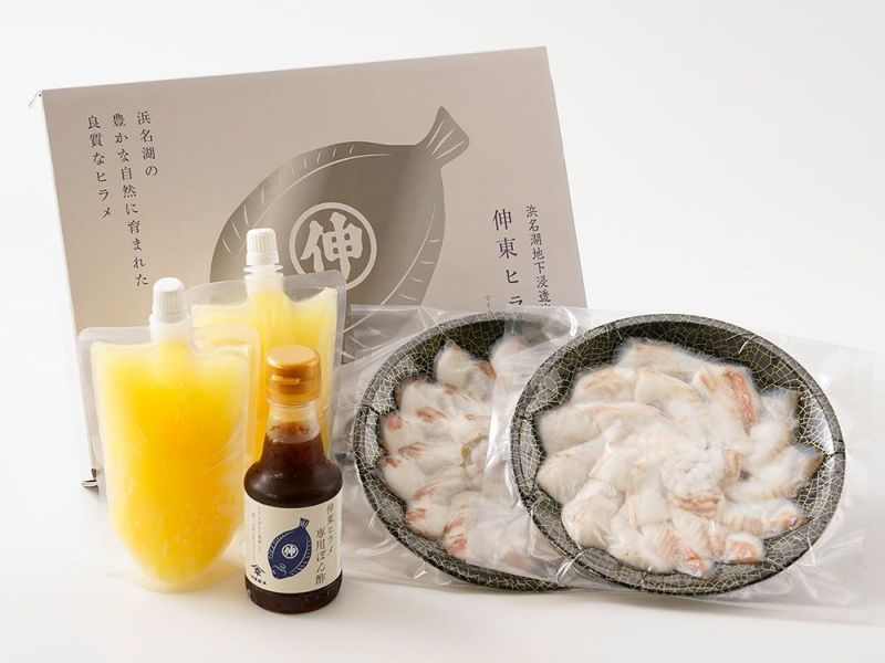 伸東ヒラメの刺身と、特製ヒラメ出汁、ヒラメ専用ポン酢のセット。ヒラメ出汁は、浜名湖食彩わらしべの橋本料理長さんが伸東養魚のために試作を重ね、独自開発したもの。芳醇な香りと上品な旨味が詰まった出汁(2倍濃縮)です。